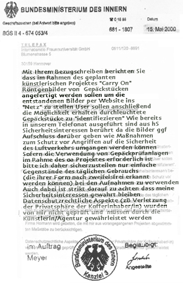 CARRY ON attempted an interface that would upload X-rayed suitcases from Hi-Scan machines to the internet. The initial plan was to "stage" suitcase packaging and inspection as public performance with students and migrant communities at EXPO 2000' s high security environment or at the airports in Hannover and Hamburg. The request to work with Heimann Systems' Hi-Scan machines was forwarded to BUNDESMINISTERIUM DES INNERN (Federal Ministry of Internal Affaires of Germany). After months of negotiation, our request was denied. Barbara Loreck, coordinator of ART CONCEPT at IFU, received a fax that stated- In reference to your letter that stated the art project "Carry On" would have 20 pieces of suitcases X-ray scanned and loaded onto the "Net" as website and afterwards the net-users are able to "identify" the scanned pieces of the suitcase. As has already been explained in our telephone conversation, from our point of view, these images could possibly give information about how to circumvent measures taken for the protection of attacks on the security of air traffic. Provided that the use of a luggage control scanning system with regard to the project described above is necessary, I request that it is guaranteed that only objects of daily use (of which the form can be identified without any doubt) are used (for recording). Pertaining to that also, strict attention is to be paid to protecting my interests concerning security. Legal aspects as regards data protection (e.g. Injury to the privacy of the owner of the suitcase) are not checked by me and must be ensured by the artist/agency. |